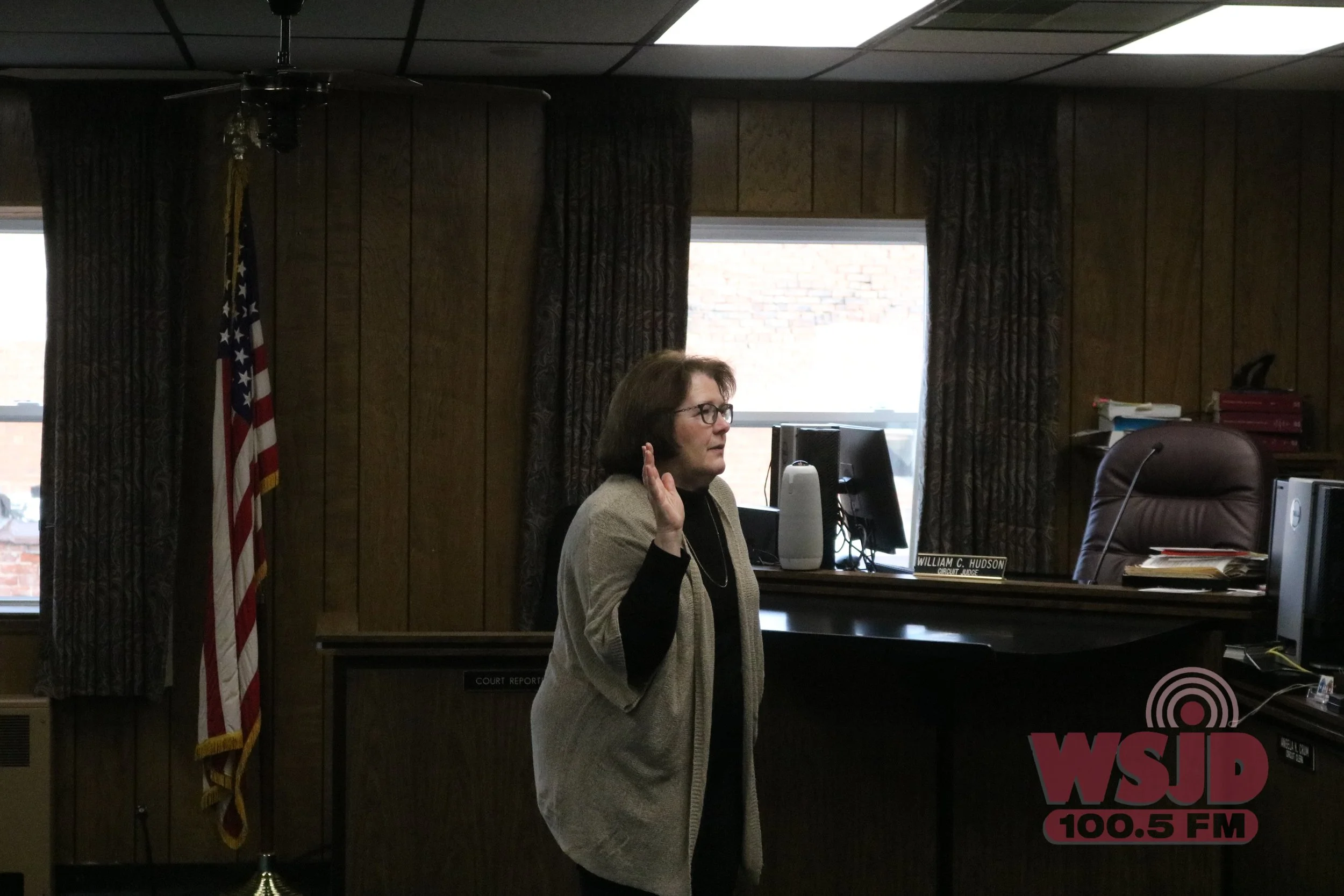 County treasurer Angela Broster takes the oath of office from Judge William C. Hudson