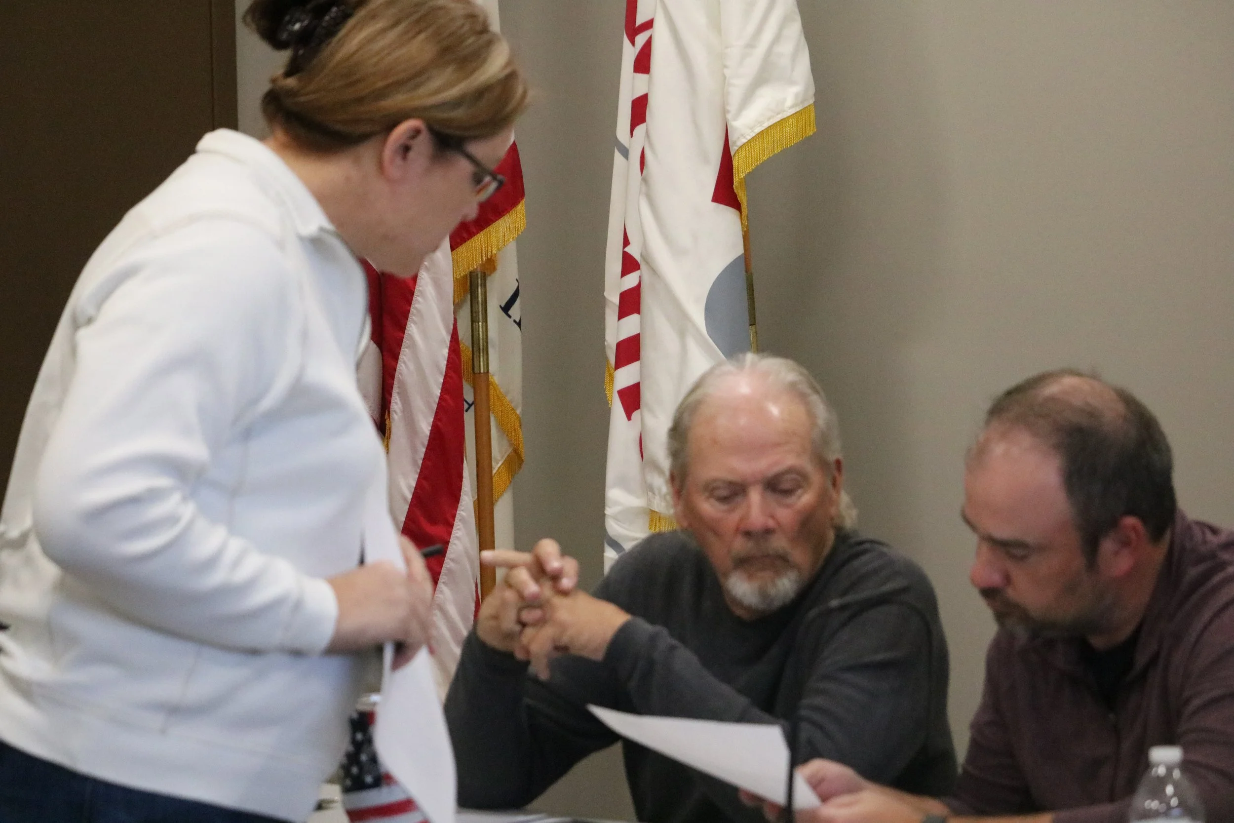 Rachel Wallace shows City Commissioners Tom Meeks and Eric Ikremire plans for the new Scooter’s Coffee slated to open this summer at 9th and Market Streets.