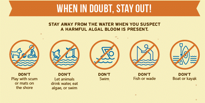 When a bloom producing toxins has been confirmed, local officials are advised to post appropriate signage to warn residents to avoid contact with affected waters. However, not all blooms are reported to state officials. Therefore, residents are advised to avoid contact with water that: