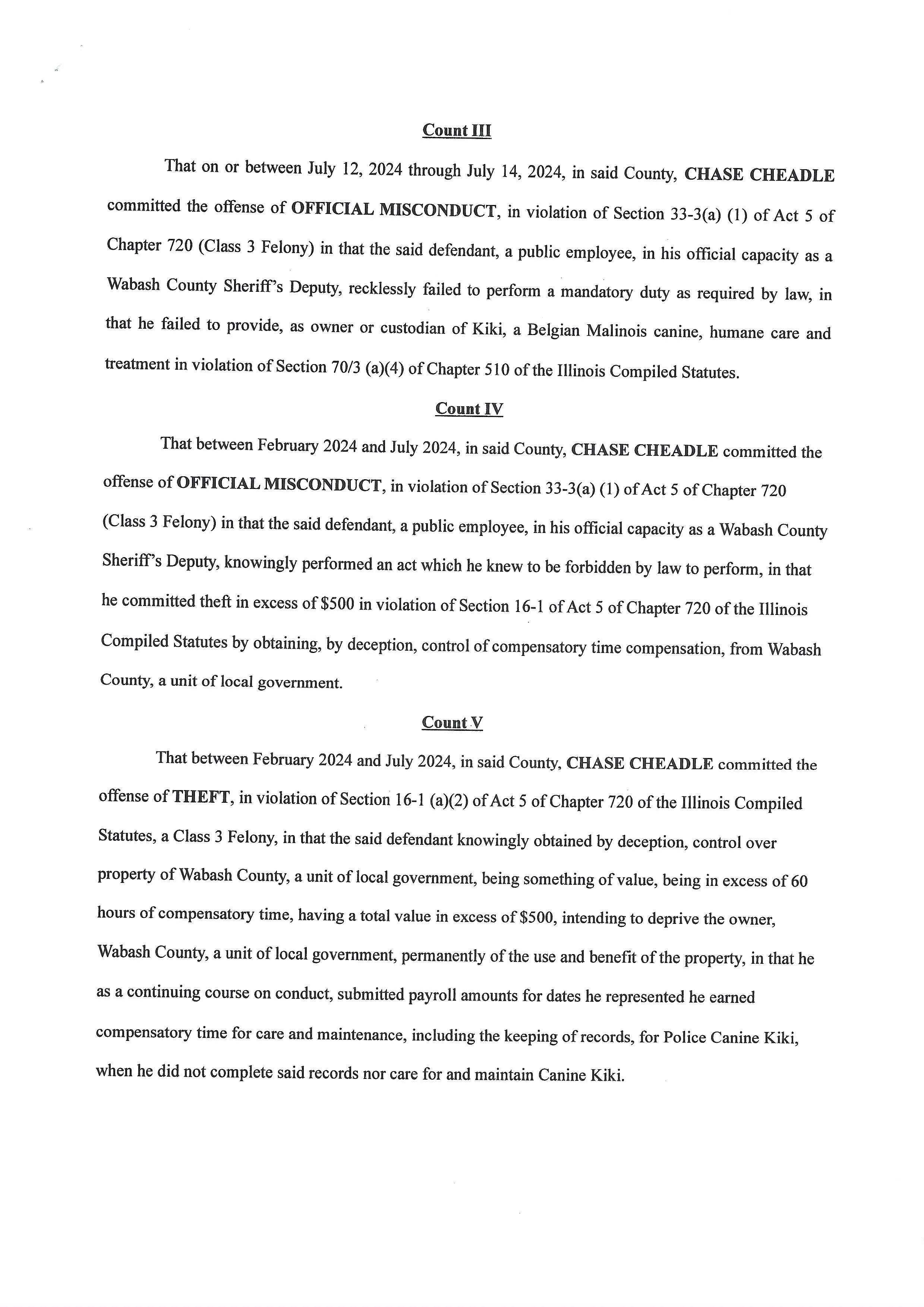 Cheadle faces four charges of official misconduct in that he allegedly placed Kiki in a life-threatening situation for a prolonged period of time in extreme heat that resulted in her death. It’s also alleged that Cheadle did not provide Kiki with adequate shelter and protection from the weather and failed to provide humane care and treatment. The fourth misconduct charge alleges Cheadle that he committed theft in excess of $500 by deceptively obtaining control of compensatory time compensation from Wabash County. The felony theft charge is in connection to submitted payroll amounts for dates he represented he earned comp time for care and maintenance, including the keeping of records, for Kiki, when he did not complete the records nor care for and maintain Kiki.