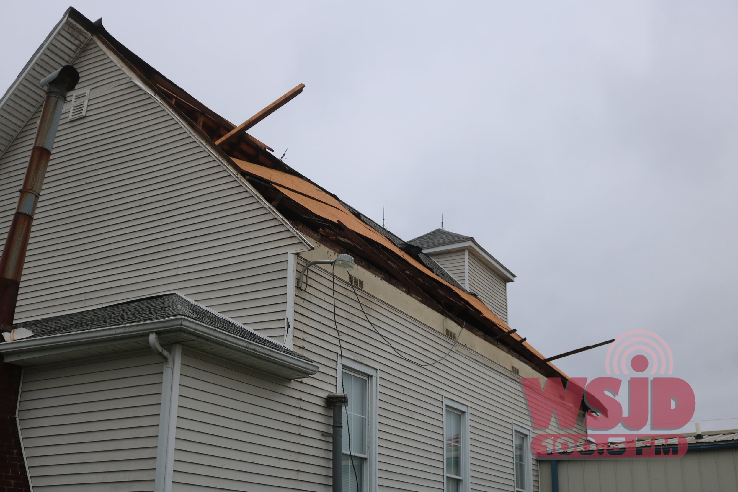 Despite extensive storm damage to the roof over its’ sanctuary, Lick Prairie Christian Church will hold services as scheduled on Sunday. Pastor Steve Williamson and his wife Vicki were at the church Friday morning along with dozens of congregation members and other members of the community cleaning up from Thursday night’s severe storm. We visited with Steve about the damage…