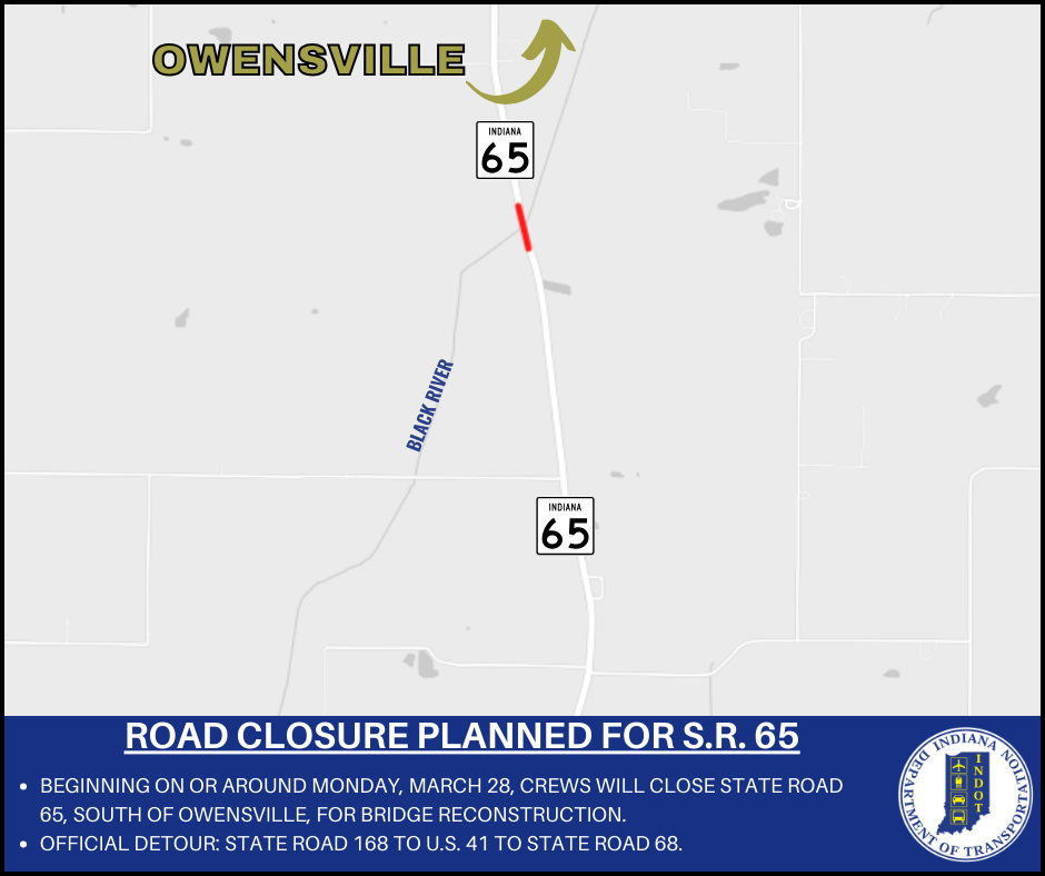 Beginning on or around Monday, March 25, crews will close State Road 65, two miles south of Owensville, over Black River. This road closure will allow for a bridge reconstruction project. This project is expected to last through the beginning of May, depending on the weather.