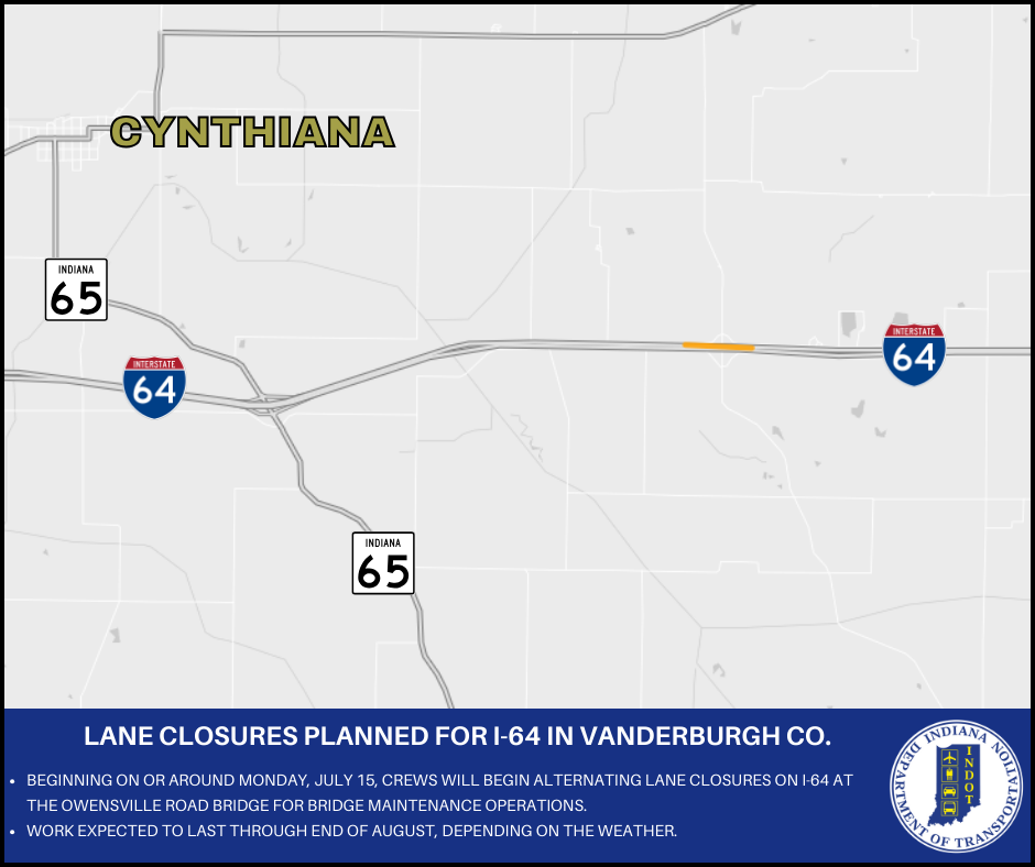 Beginning on or around Monday, July 15, crews will begin alternating lane closures in both directions of travel on I-64 in Vanderburgh County at the Owensville Road Bridge. One lane of traffic will be open in both directions during this project.