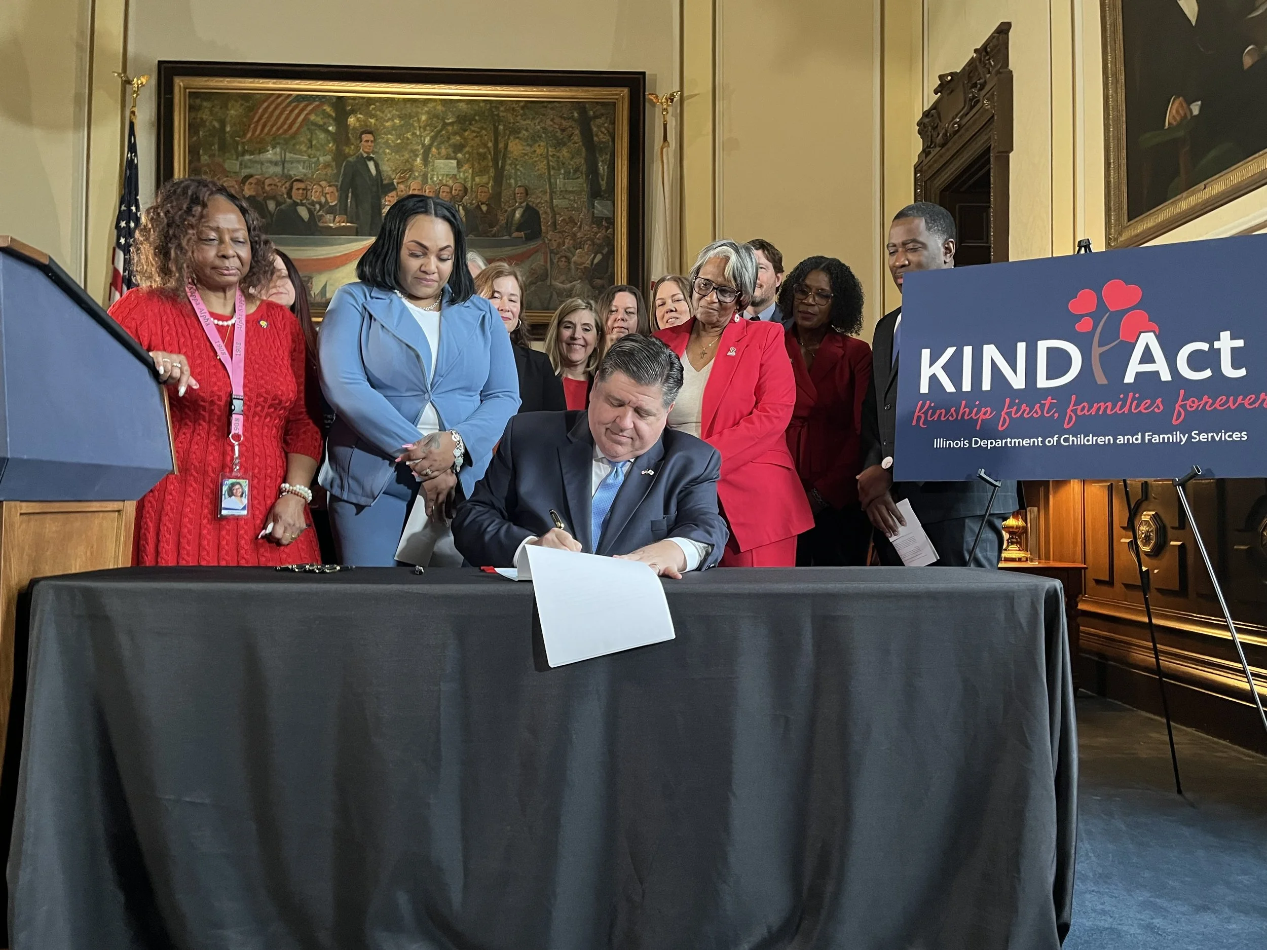 Pritzker signed the Kinship in Demand Act, or KIND Act, at a ceremony at the Statehouse. The new law puts an obligation on the Department of Children and Family Services to use a “kin-first approach” when placing children in foster care.