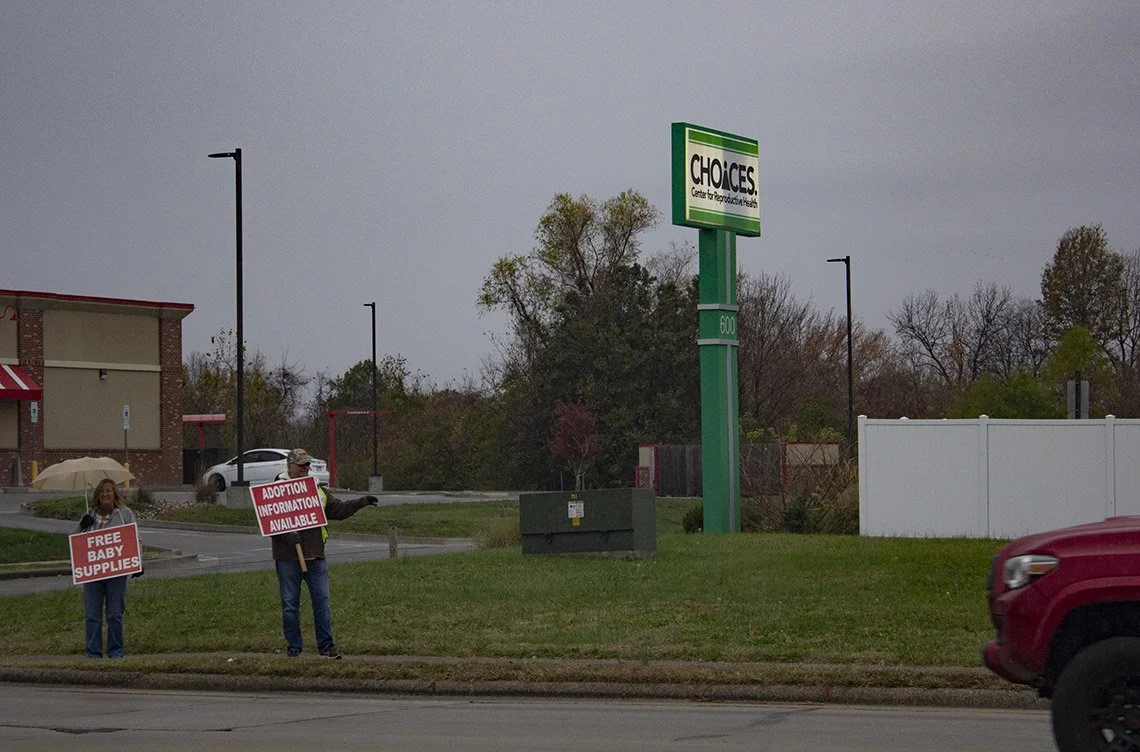 Anti-abortion activists display signs and wave at passing cars on a rainy morning in November in front of CHOICES Center for Reproductive Health in Carbondale. (Saluki Local Reporting Lab photo by Carly Gist)