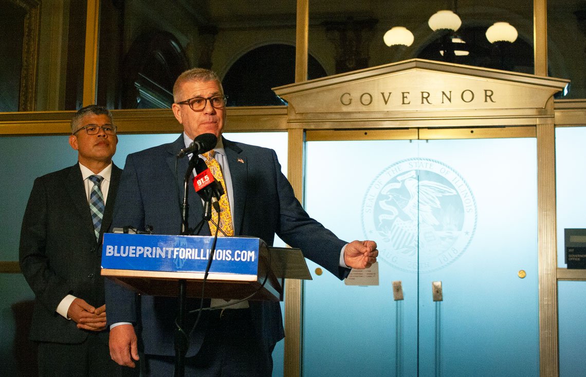 Republican candidate for governor Darren Bailey speaks at a news conference with running mate Aaron Del Mar on Jan. 8, 2026. (Capitol News Illinois photo by Jenna Schweikert)