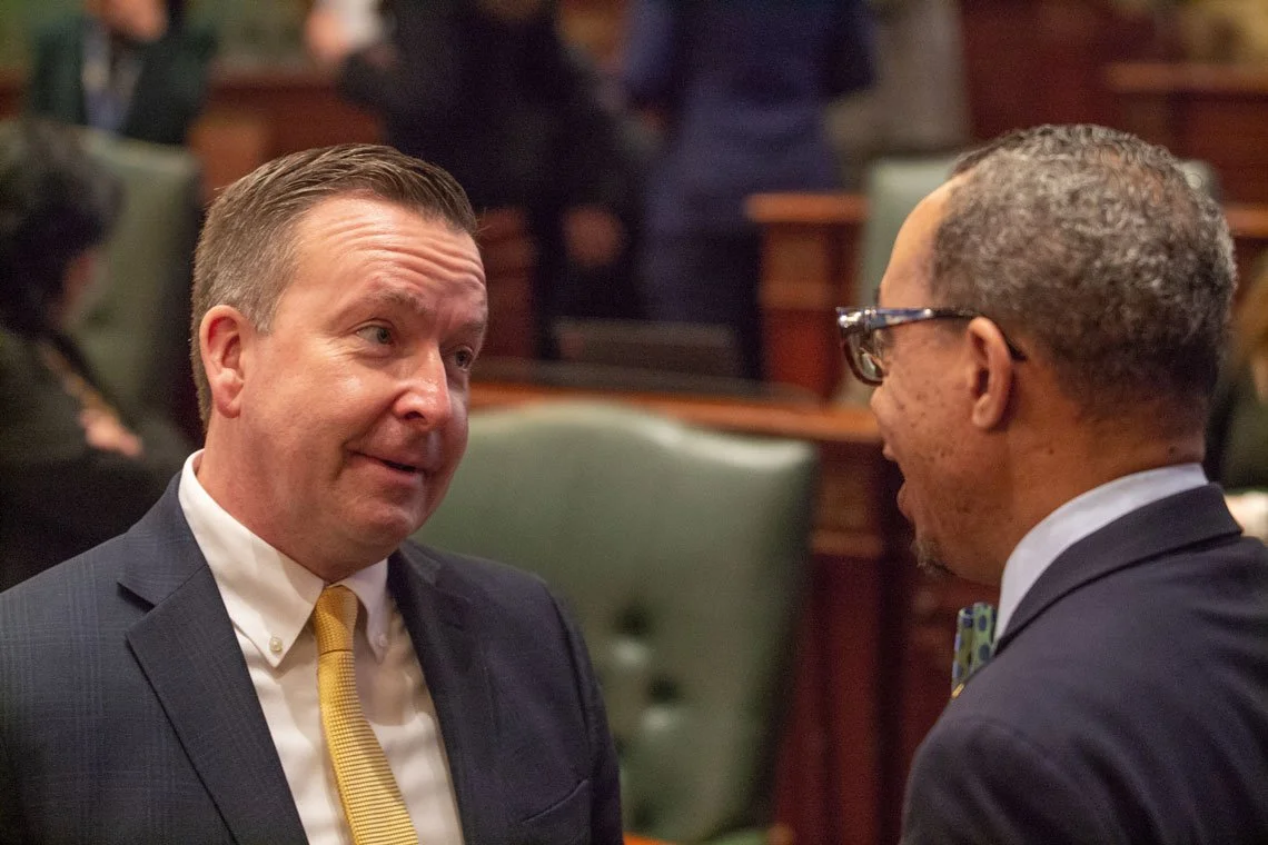 Andy Manar, a senior budget official in Gov. JB Pritzker’s office, talks to lawmakers before the governor’s budget address on Wednesday, Feb. 18, 2026. (Capitol News Illinois photo by Jerry Nowicki)