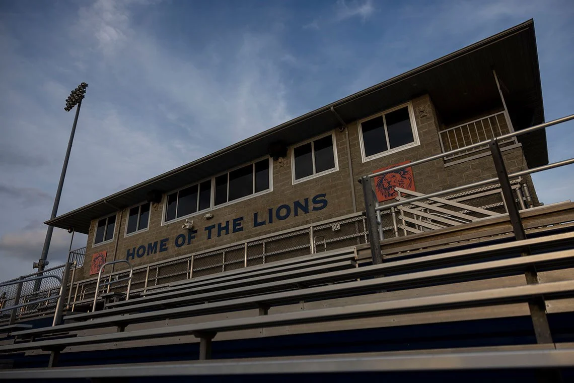The sun sets on the press box of the Lion’s Field football stadium at Carterville High School on March 3, 2026, in Carterville, Illinois. (Photo by Lylee Gibbs)