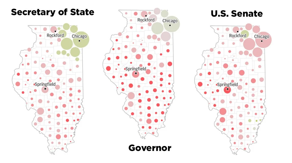 Election results from the 2026 March primary reported by the Associated Press show differences in voters’ preferences between the Chicago area and downstate counties. (Capitol News Illinois illustration)