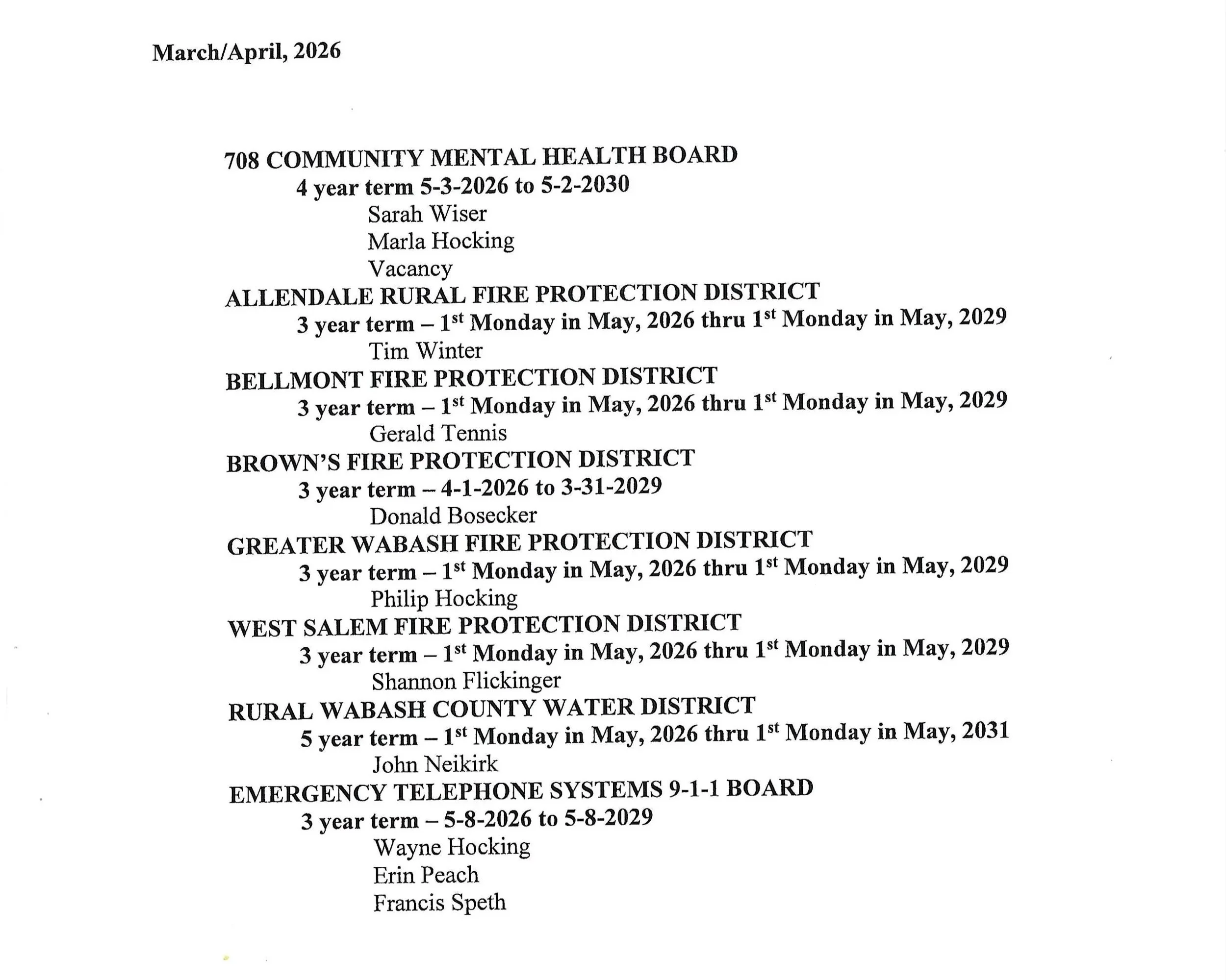 April 21, 2026 Chandler Madden County Board Makes Various Appointments April 21, 2026 Chandler Madden Wabash County Commissioners made these appointments at their meeting Monday afternoon. Chandler Madden