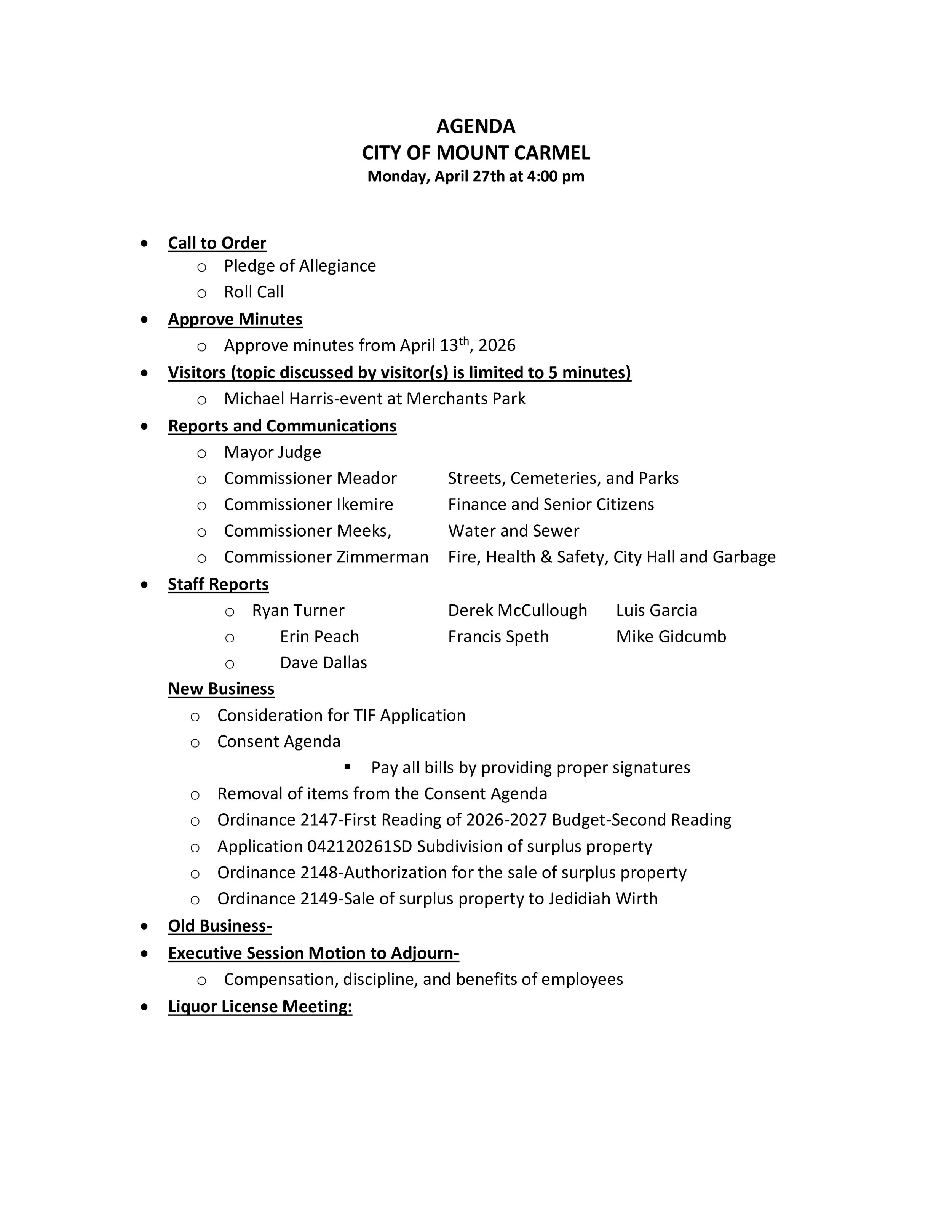 April 24, 2026 Chandler Madden Mt. Carmel City Council Agenda April 24, 2026 Chandler Madden 4pm Monday Chandler Madden
