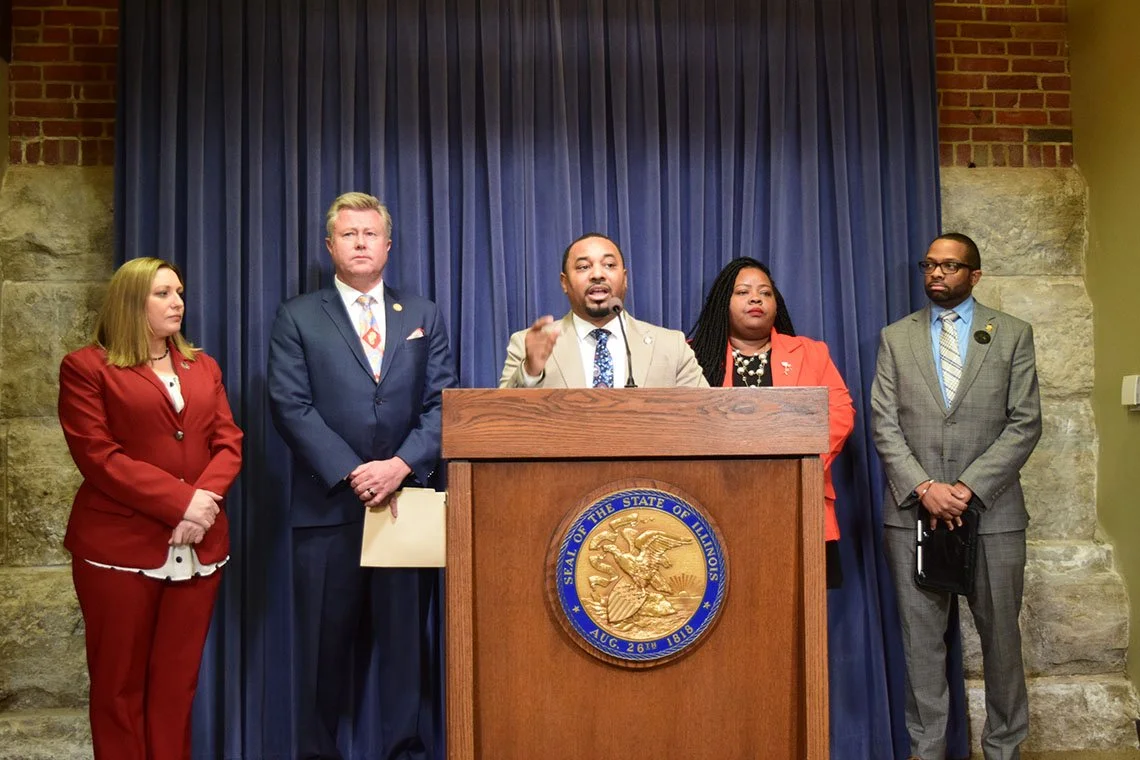 Democratic Sen. Willie Preston, center, speaks at a Statehouse news conference Wednesday, Feb. 5, 2025, about his bill to ban certain additives from foods sold in Illinois. Joining him were, from left: Sens. Rachel Ventura; Seth Lewis; Lakesia Collins; and Rep. Michael Crawford. (Capitol News Illinois photo by Jade Aubrey)