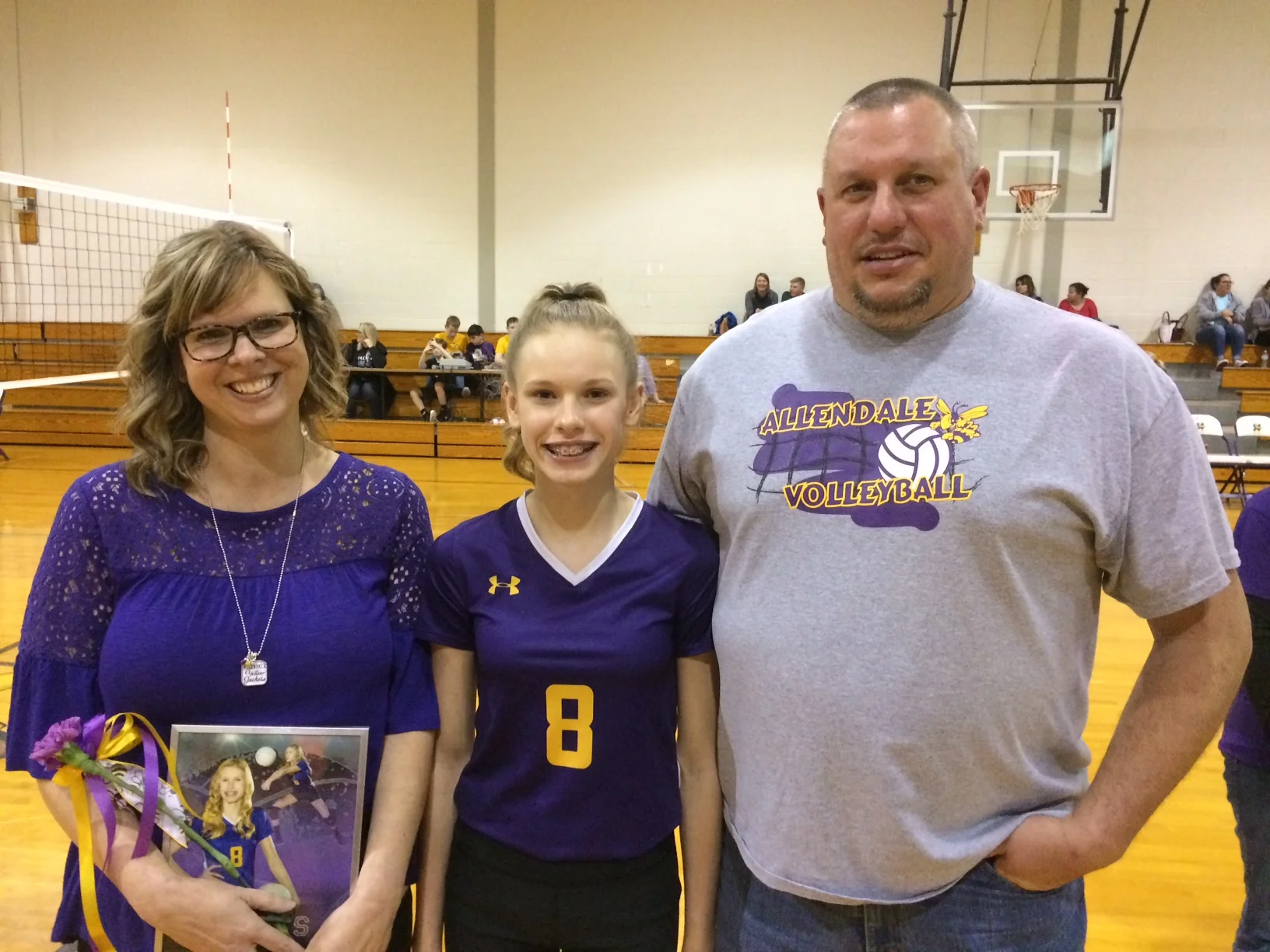 On Thursday, March 1st, the Allendale Yellow Jackets held 8th grade night for its volleyball team. Madison Adams, Kinze Cusick, Lexi Fisher, Alex Isaac, Katie Jackson, Taylor Woods, and manager Holly Lofton were all recognized prior to the game against New Hope. The girls also gave recognition to their coaches, Kristi Isaac and Patti Thompson, as both coaches were coaching in their final home game of their career. Coach Isaac has been a volleyball coach at Allendale for 10 years and Coach Thompson has coached for 7 years with the Yellow Jackets.