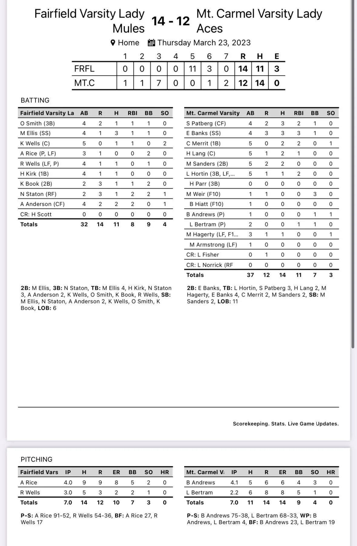 March 24, 2023 Chandler Madden Lady Aces' 34 Game Regular Season Winning Streak Ends In High Scoring Loss To Fairfield March 24, 2023 Chandler Madden An 11-run 5th inning propelled the Lady Mules past Mt. Carmel. Chandler Madden