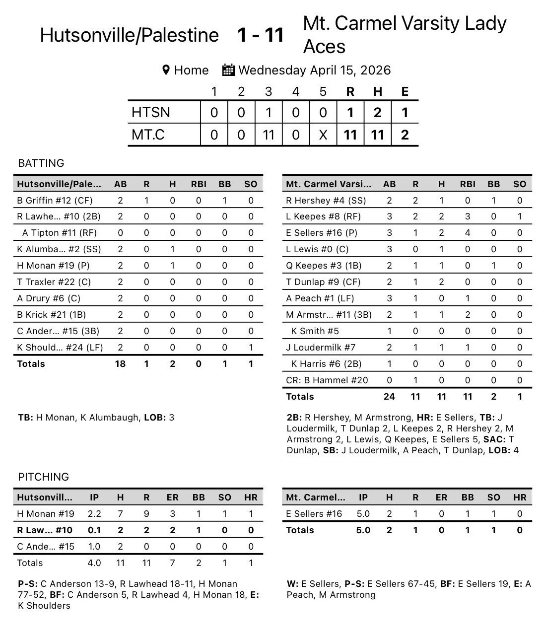 April 15, 2026 Chandler Madden 11 Run 3rd Propels Lady Aces To 5 Inning Win April 15, 2026 Chandler Madden Evie Sellers goes distance in the circle and knocks in 4 with homer at the plate. Chandler Madden