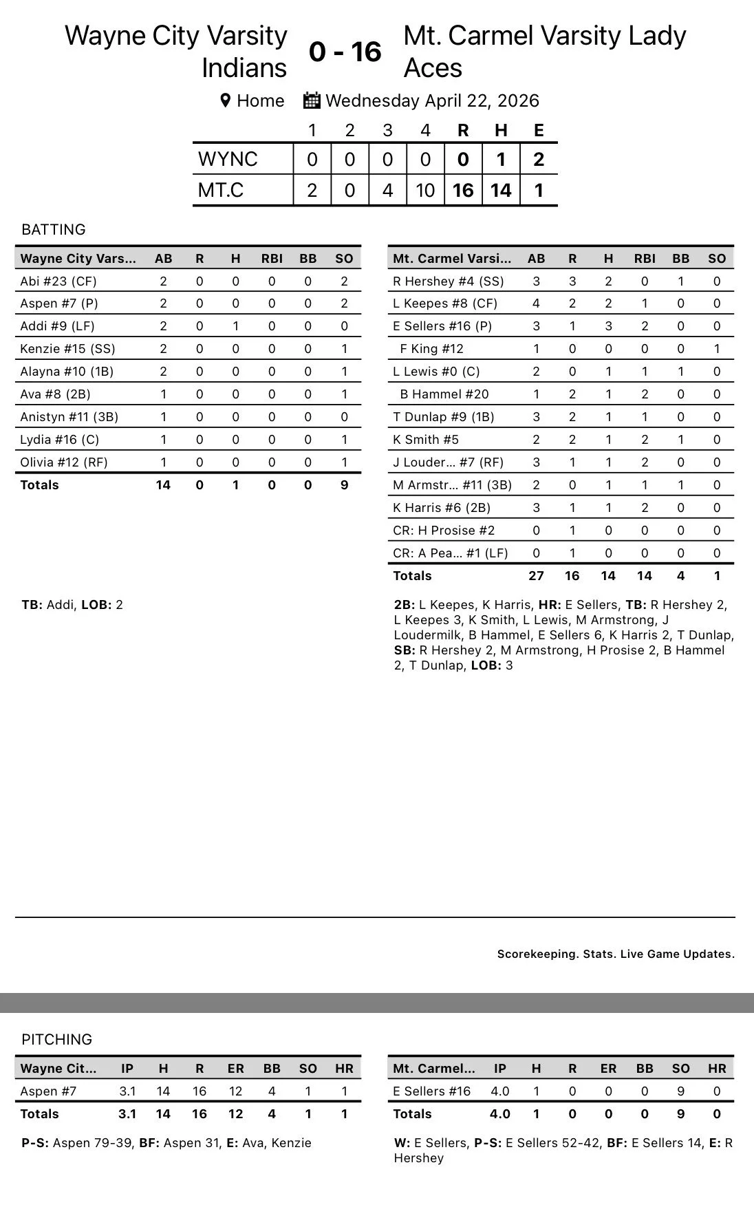April 22, 2026 Chandler Madden Lady Aces Score 10 In 4th To Squash Wayne City, 16-0 April 22, 2026 Chandler Madden Evie Sellers allows just 1 hit in the circle for Mt. Carmel. Lady Aces host Casey Thursday afternoon in key LIC matchup. Chandler Madden