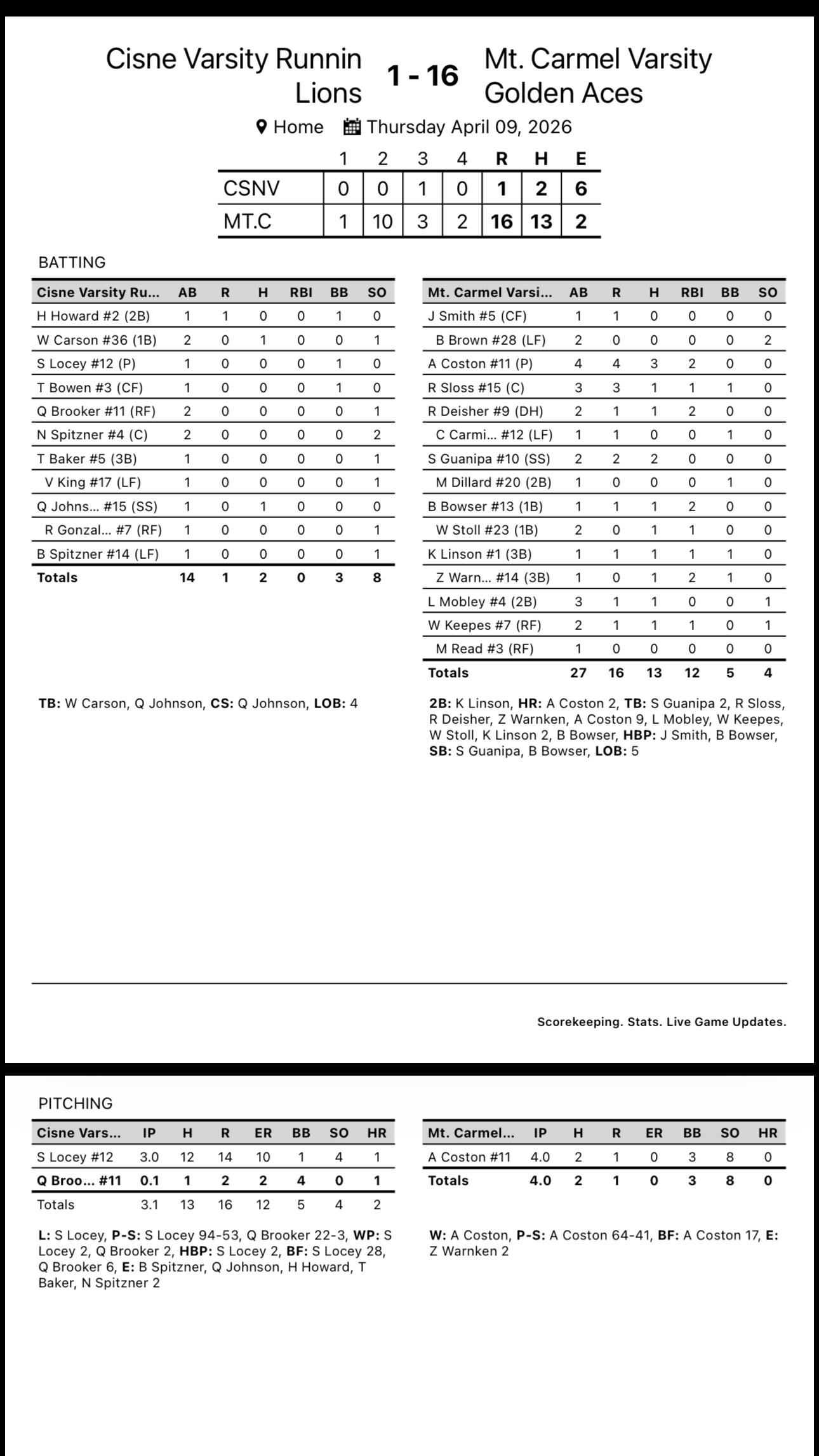 From Coach Tyler Browning: Golden Aces improve their record to 6-3 on the season with the 16-1 victory over Cisne. Aces managed 13 total hits in the game, including hits by 10 different players! The slugger for the game was Asher Coston, who went 3-4 at the plate with 2 home runs. Coston also pitched a complete game on the mound with 8 K’s.