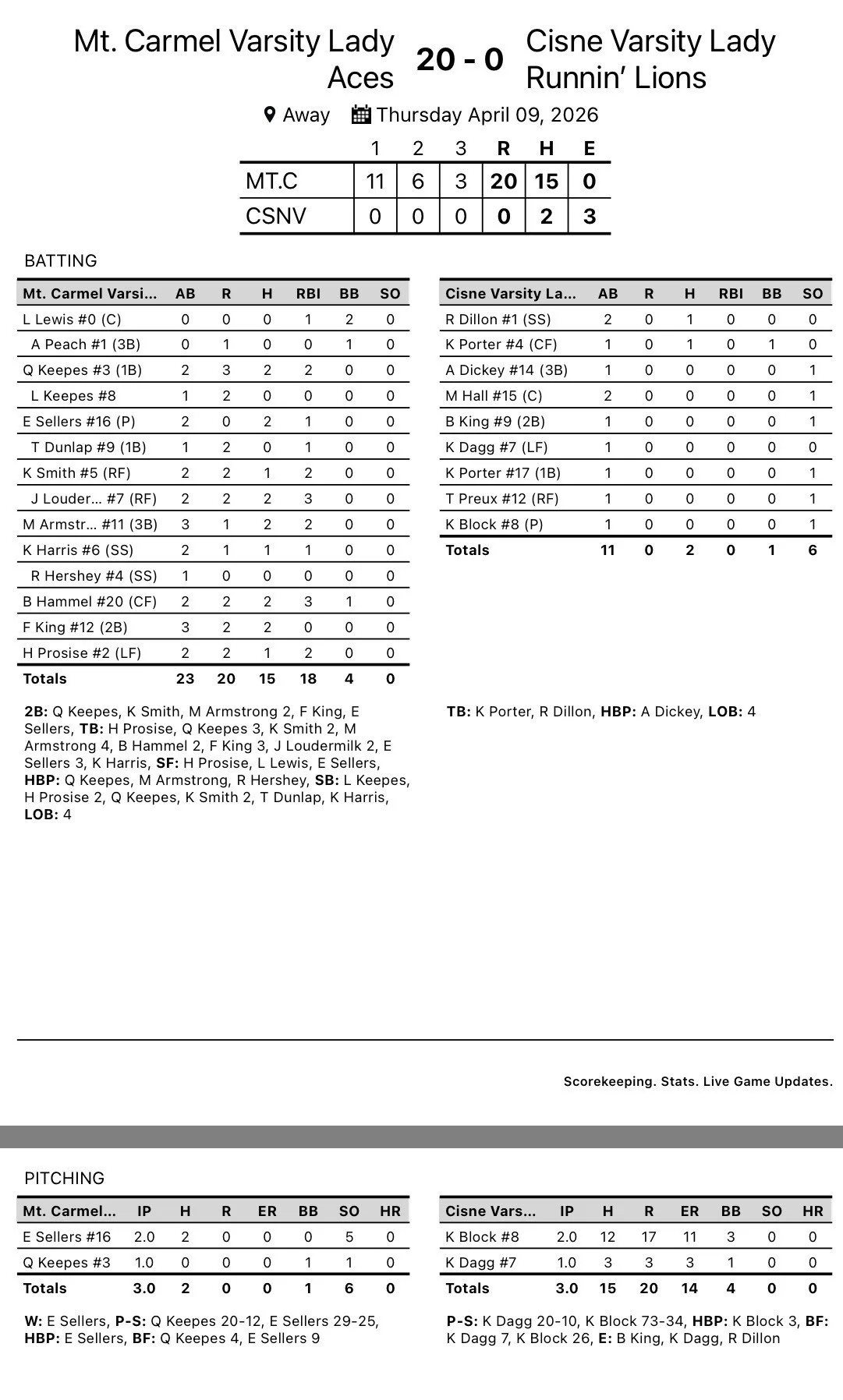 April 9, 2026 Chandler Madden Lady Aces Blast Cisne, 20-0 April 9, 2026 Chandler Madden 11-run 1st keeps Mt. Carmel unbeaten. Chandler Madden